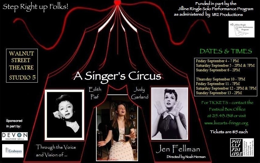 Step right up, folks! Meet Jen Fellman as she explores her own journey as a singer through the lives and music of Judy Garland and Edith Piaf. Song, story and clown combine in this unique solo Cabaret.